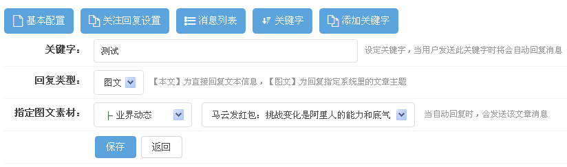 四、设置成功后,进入微信公众号中,输入您设置的关键词即显示出设置的信息